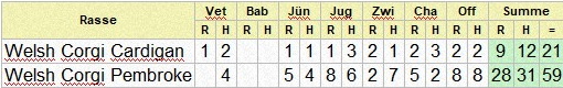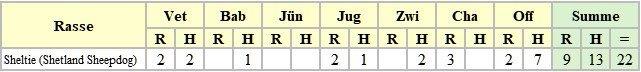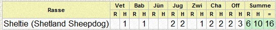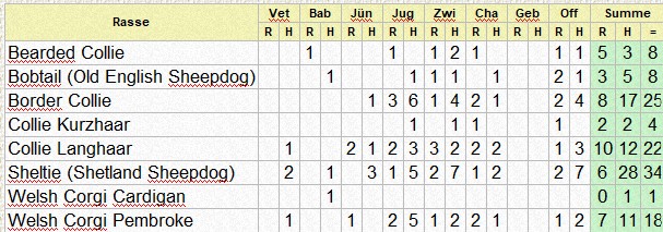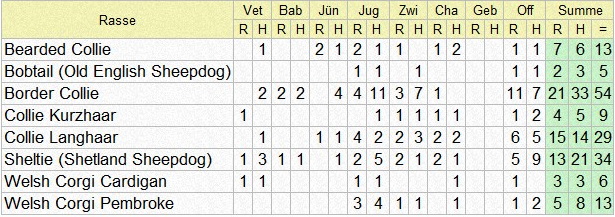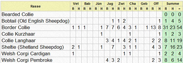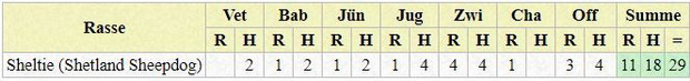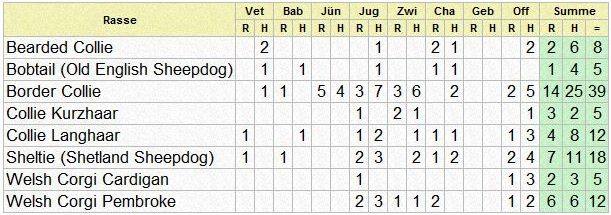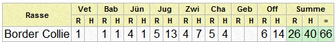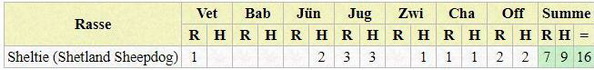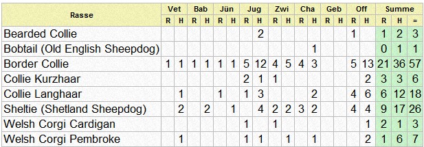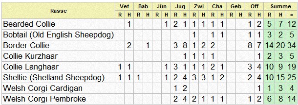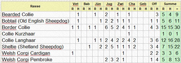 | Rasse | Vet | Bab | J? | Jug | Zwi | Cha | Off | Summe | |||||||||