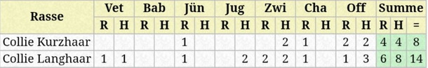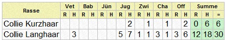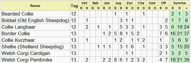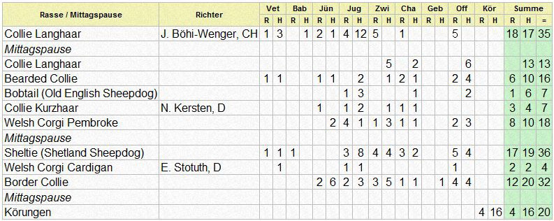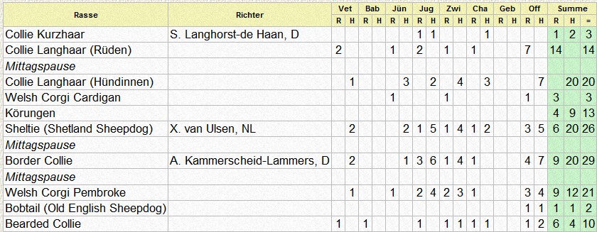 | Rasse | Ring | Richter | Beginn | Vet | Bab | J? | Jug | Zwi | Cha | Geb | Off | Summe | ||||||||||