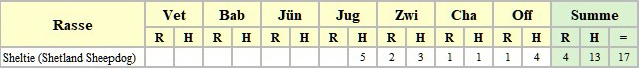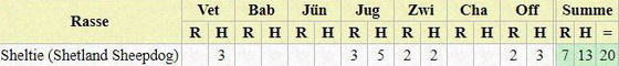 | Sheltie (Shetland Sheepdog) | 3 | 6 | 20 | 5 | 4 | 1 | 1 | 7 | 2 | 20 | 30 | 50 | |||||||||
