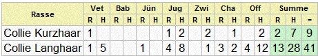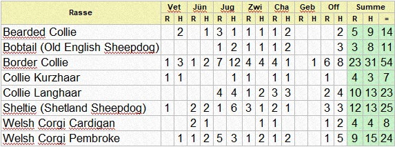| Rasse | Richter | Vet | Bab | J? | Jug | Zwi | Cha | Geb | Off | Summe | ||||||||||