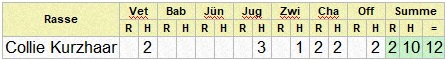 | Collie Kurzhaar | 1 | 1 | 1 | 1 | 1 | 1 | 6 | ||||||||