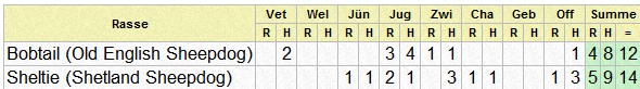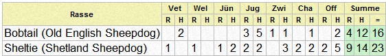 | Bobtail (Old English Sheepdog) | ca 15.00 | 1 | 2 | 1 | 1 | 1 | 4 | 1 | 9 | 10 | ||||||||||||